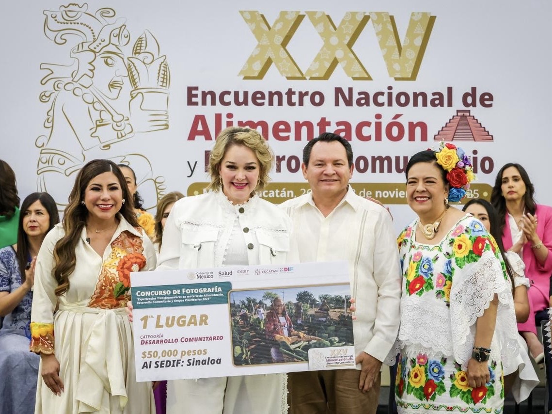 Mérida, Yucatán, a 26 de noviembre del 2025.- En el marco del XXV Encuentro Nacional de Alimentación y Desarrollo Comunitario que organiza el Sistema Nacional DIF y el Sistema DIF Yucatán, la Dra. Eneyda Rocha Ruiz, presidenta del Sistema DIF Sinaloa, recibió de manos del gobernador de Yucatán, maestro Joaquín Díaz Mena, el premio del primer lugar en la categoría de Programa de Salud y Bienestar Comunitario y el tercer lugar con la fotografía del Programa de Atención Alimentaria a Personas en Situación de Emergencia y Desastre.