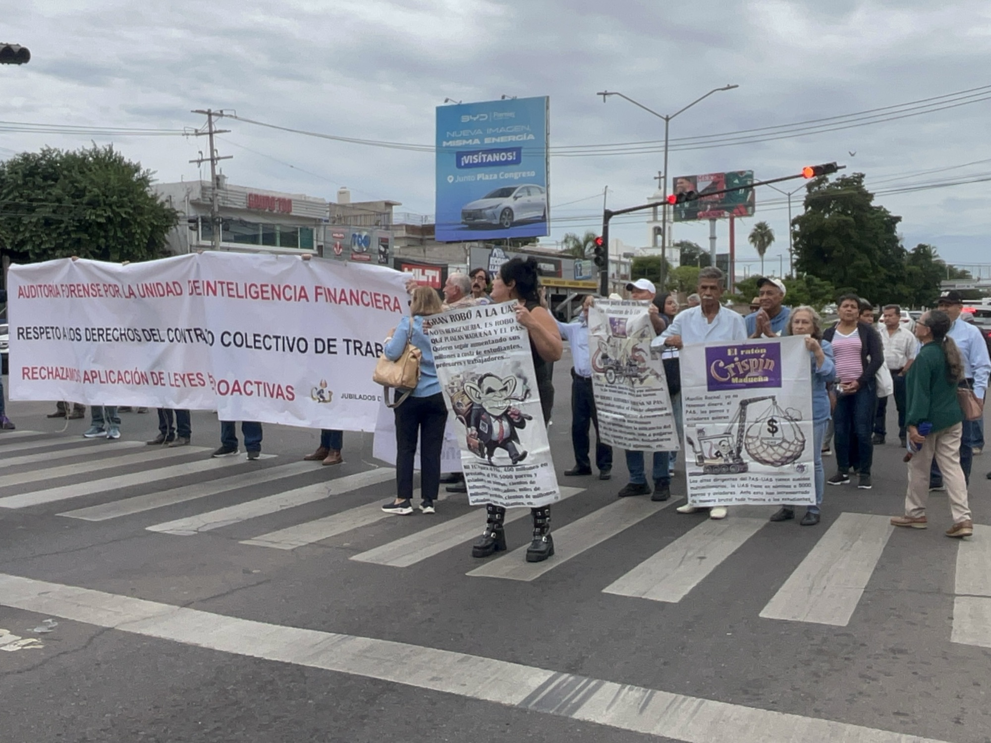 Culiacán, Sinaloa; diciembre 04 de 2025.- Jubilados de la Universidad Autónoma de Sinaloa (UAS) se manifestaron este miércoles a las afueras del Congreso del Estado, donde con lonas y megáfonos exigieron transparencia y un NO rotundo a la Reingeniería de la institución. Entre las consignas más repetidas se escuchaban: