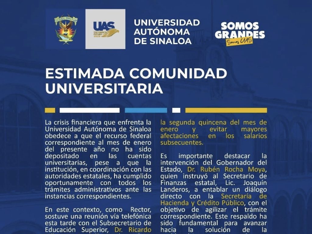 A través de un comunicado emitido a la comunidad universitaria, el rector de la UAS, Dr. Jesús Madueña Molina manifestó que luego de sostener una reunión vía telefónica con el subsecretario de Educación Superior, Dr. Ricardo Villanueva Lomelí, con el objetivo de establecer compromisos que permitan garantizar el pago de los salarios pendientes. Durante dicho encuentro, la Secretaría de Educación Pública asumió el compromiso de liberar el presupuesto federal universitario el próximo lunes 9 de febrero, lo que permitiría cubrir la segunda quincena del mes de enero y evitar mayores afectaciones en los pagos subsecuentes.