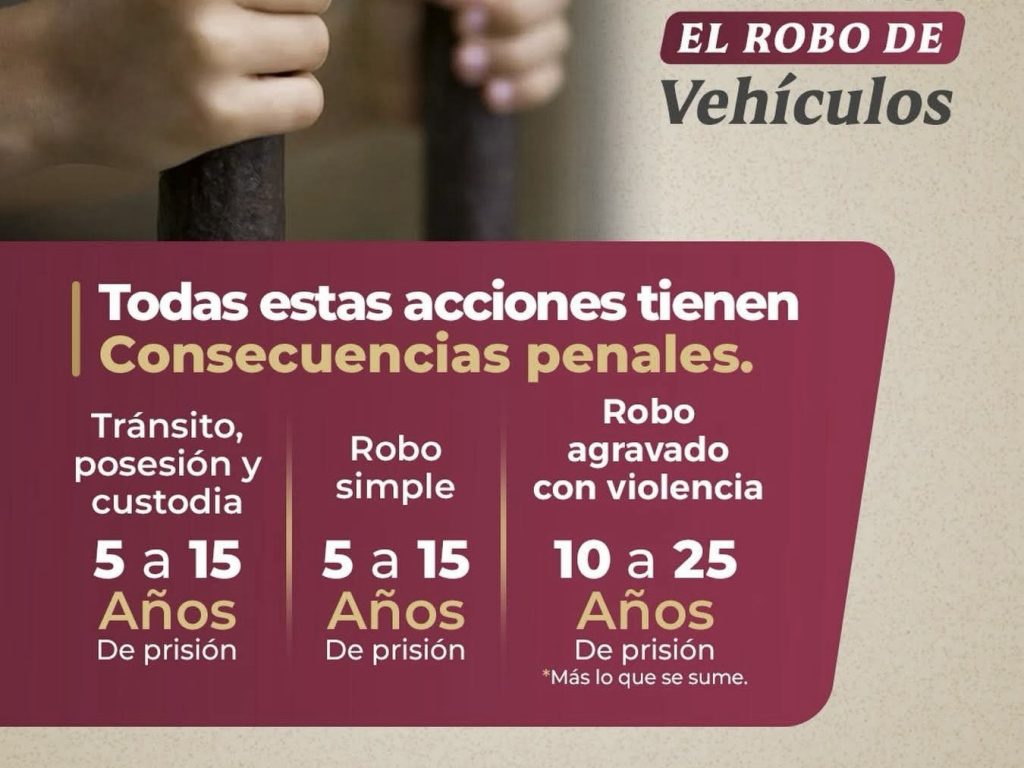 Es importante, dar a conocer a la población que, todas estas acciones tienen consecuencias penales, tales como, de 5 a 15 años de prisión por el tránsito, posesión o custodia de un vehículo robado, así como por robo simple podrían ser sancionado de 5 a 10 años de cárcel y por el robo agravado con violencia, se puede penar con 10 a 25 años de prisión.