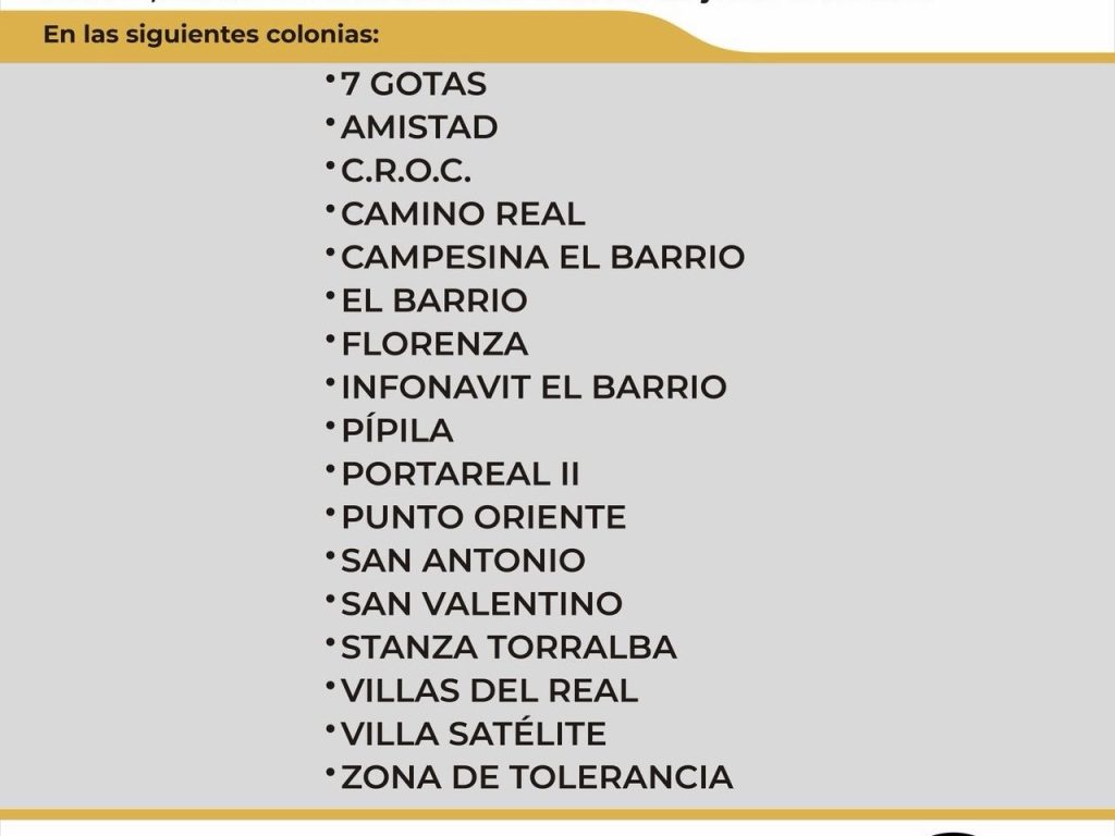 En ese sentido, se pide a los habitantes de las siguientes colonias tomar sus previsiones, ya que el servicio se normalizará hasta la mañana del jueves 9 de abril: