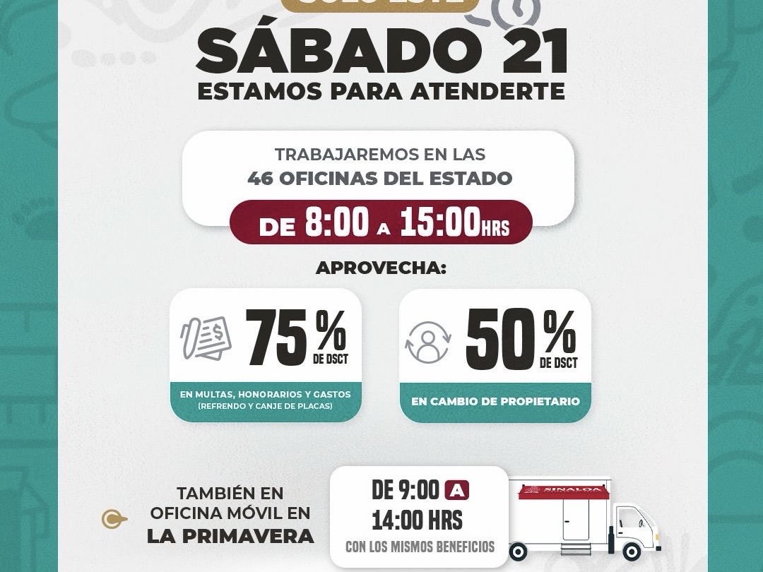 Culiacán, Sinaloa; marzo 19 de 2026.- Con el objetivo de acercar y facilitar los servicios a las familias sinaloenses, el Servicio de Administración Tributaria del Estado de Sinaloa (SATES), por instrucción del Gobernador del Estado Rubén Rocha Moya, la Lic. Silvia Karina Gutiérrez Dautt, directora de Recaudación, informó que este sábado 21 de marzo se […]
