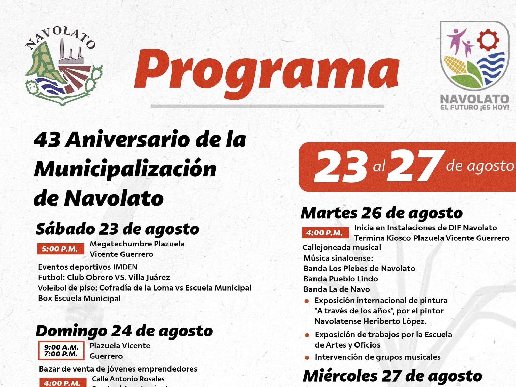 Navolato, Sinaloa, 23 de agosto de 2025.- El municipio de Navolato vivirá una gran fiesta popular del 23 al 27 de agosto, con un amplio programa de actividades artísticas, culturales, deportivas y gastronómicas para conmemorar el 43 aniversario de su municipalización, una fecha que simboliza la identidad y la unión de todas las familias navolatenses. […]